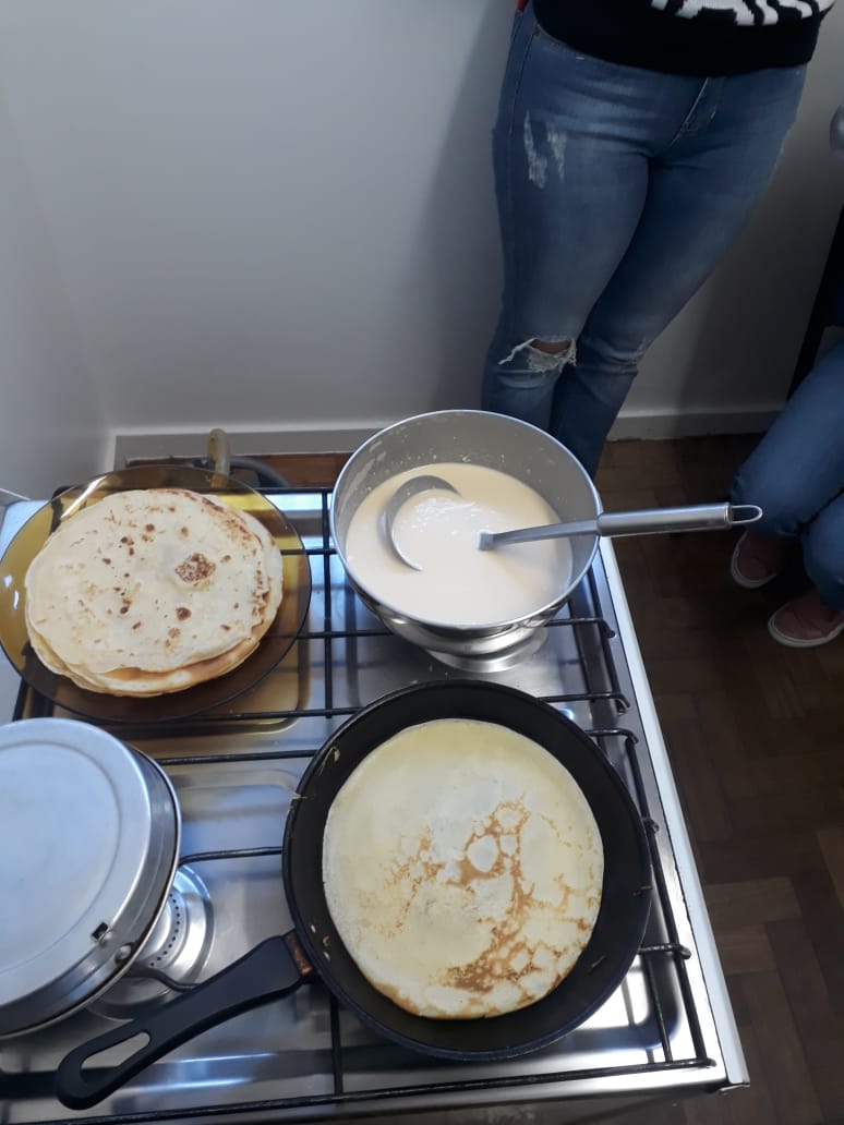 Como parte das atividades das aulas do Curso de Francês, alunos fazem crepe no College junto com a professora Priscila. Ficou uma delícia! Quer tentar, segue receita para repetir em casa.